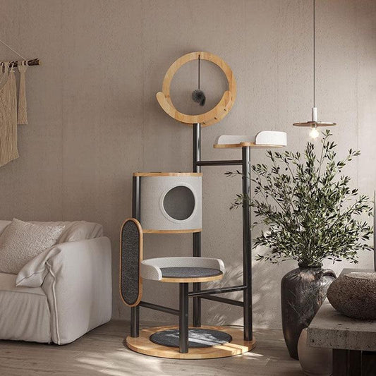 This cat tree is perfect for my energetic kitten! The wood color design is stylish and adds a modern touch to my home, while the sturdy, tall structure provides plenty of climbing, lounging, and playing options. My kitten loves the cozy space capsule and elevated platforms for observing or napping. Assembly was easy, stable and durable.