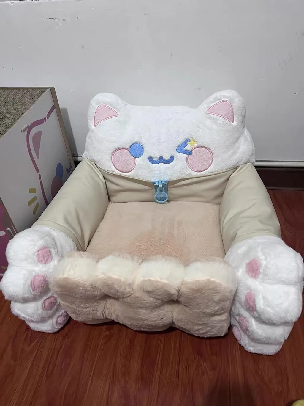 The open-style design provides easy access and ample lounging space. Simply undo the side buttons to create a double-sized area, perfect for cats who love to stretch out. Crafted with plush rabbit fur and filled with soft PP cotton, it offers gentle support for your cat's sensitive skin. -