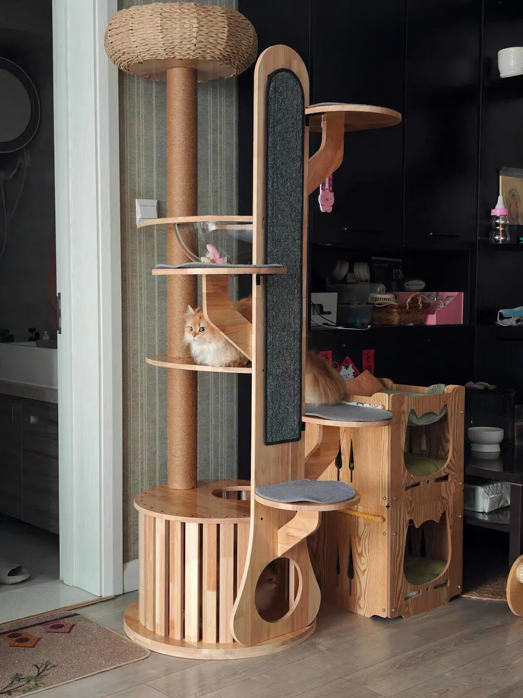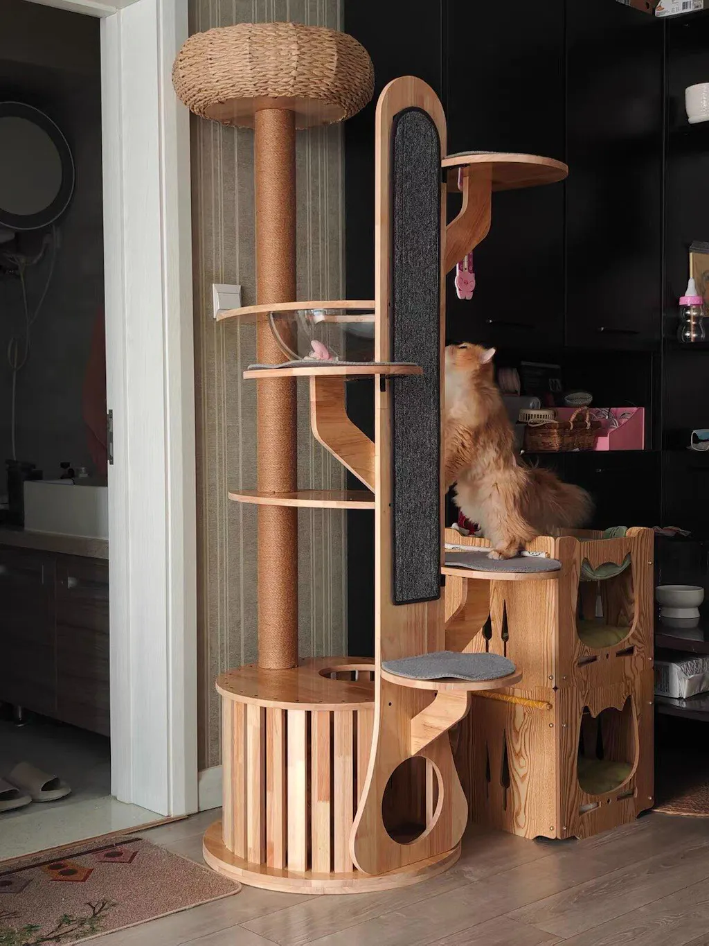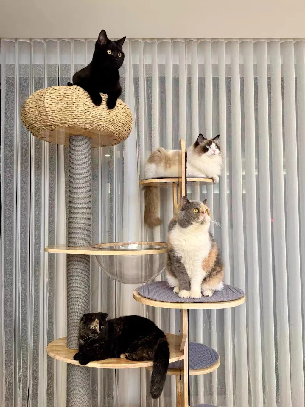 Premium Materials: Constructed from high-quality, eco-friendly rubber wood, this cat tree is UV waterproof, easy to clean, and resistant to cat hair, ensuring a stylish addition to your home.