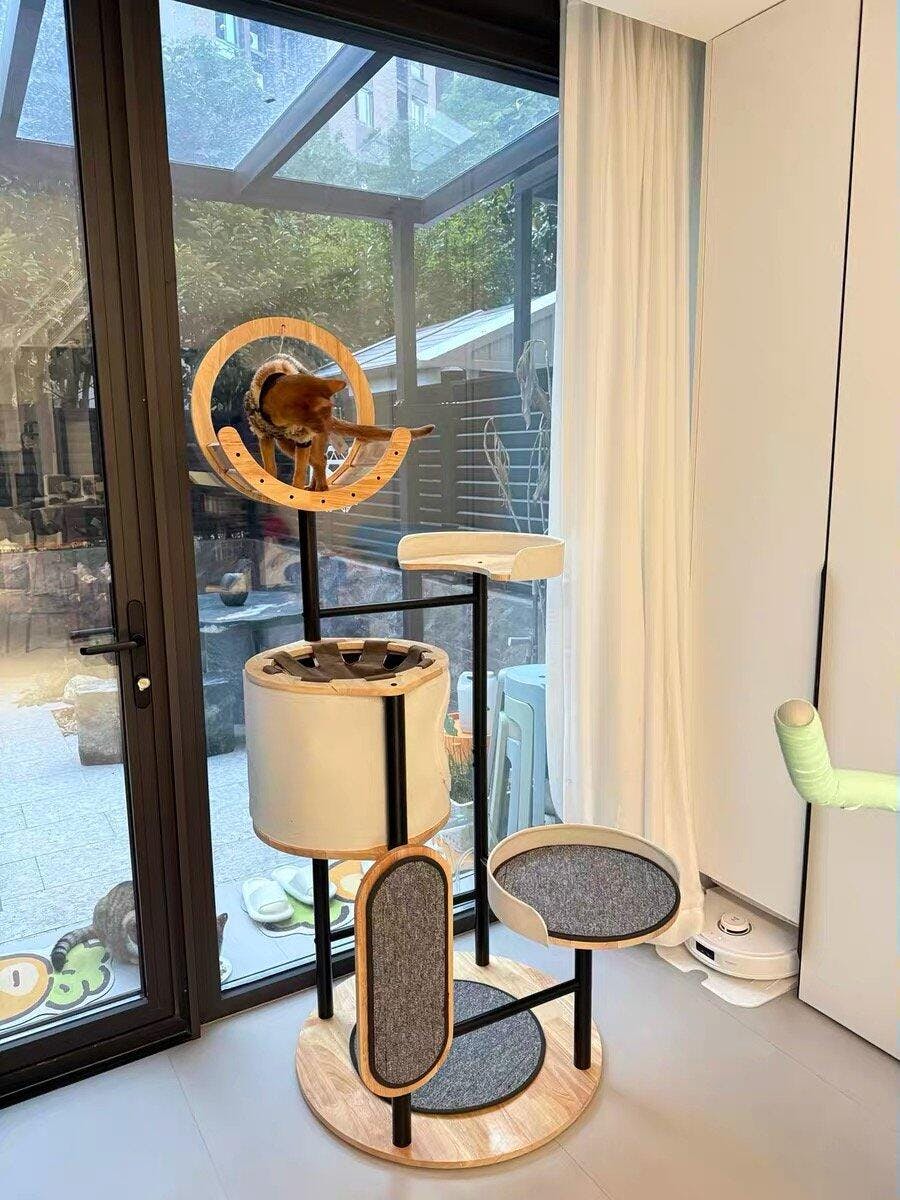 Stylish Design: The Steel Art Lively Cat Tree combines solid wood and iron artistry, creating a multi-layered fun space for your feline friend.