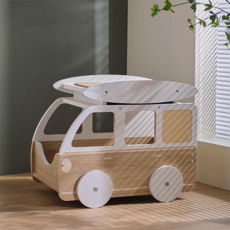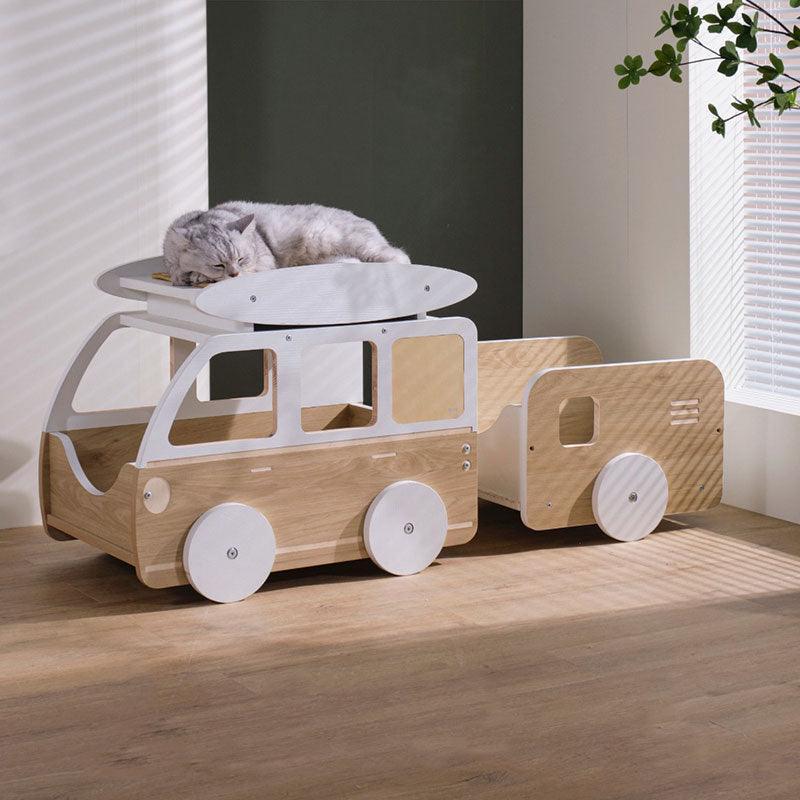 - Crafted from solid wood, this unique cat tree features a fun touring car design that will surely bring excitement to your furry friends.